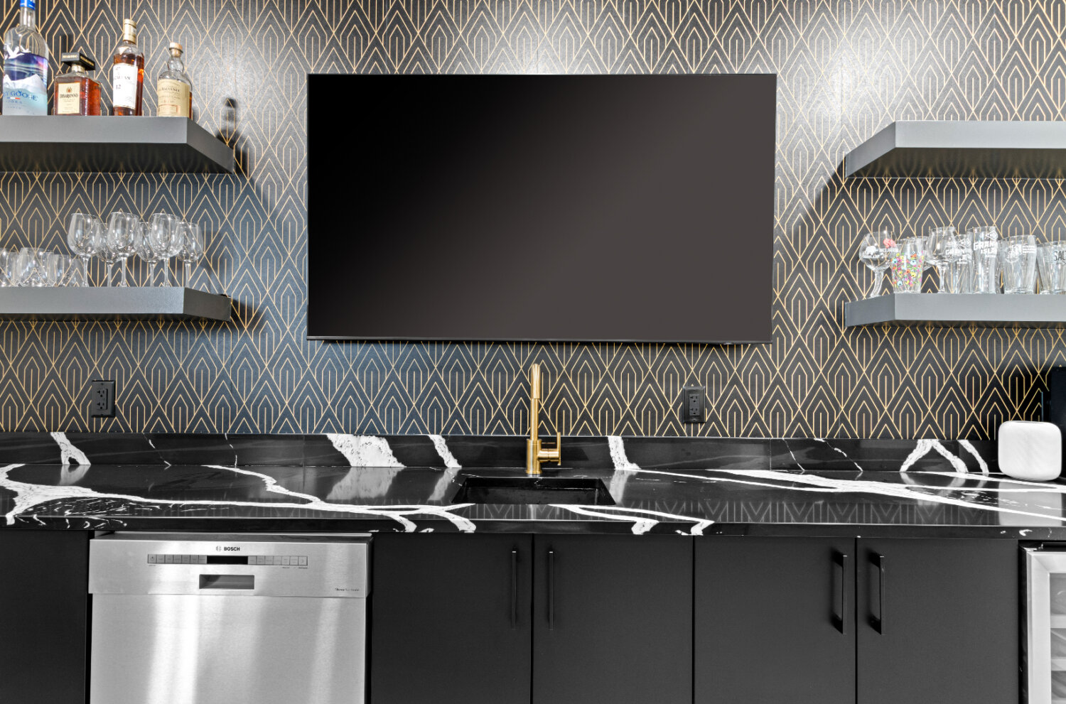 The space flows into a moody wet bar and arcade area, designed for hosting and late nights with friends. Statement wallpaper, custom cabinetry, and integrated appliances elevate the bar while keeping it functional and inviting.