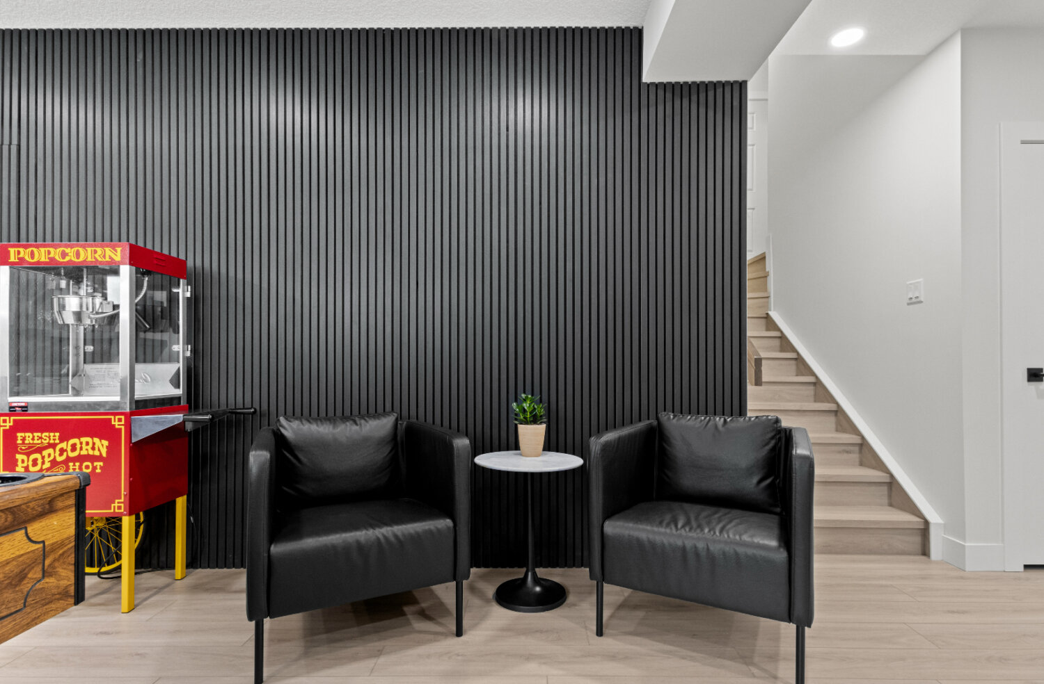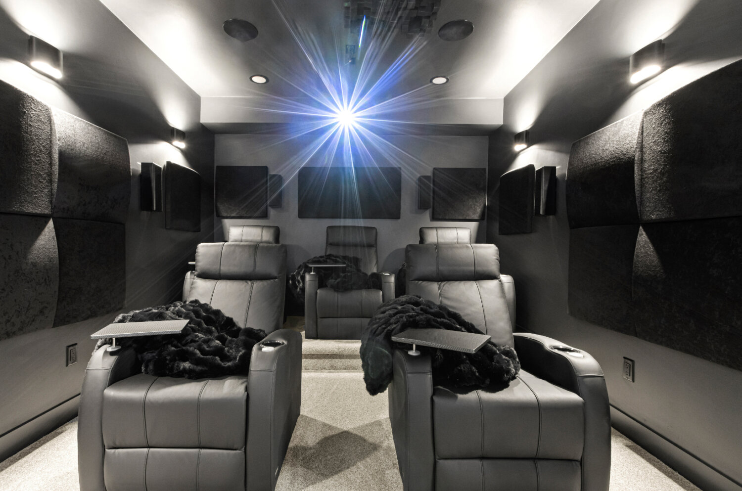 A custom sound-proof home theatre, hidden behind a concealed door, creates a cinematic experience without disturbing the rest of the home. Dark finishes, layered lighting, and acoustic wall panels set a dramatic mood while delivering high performance.